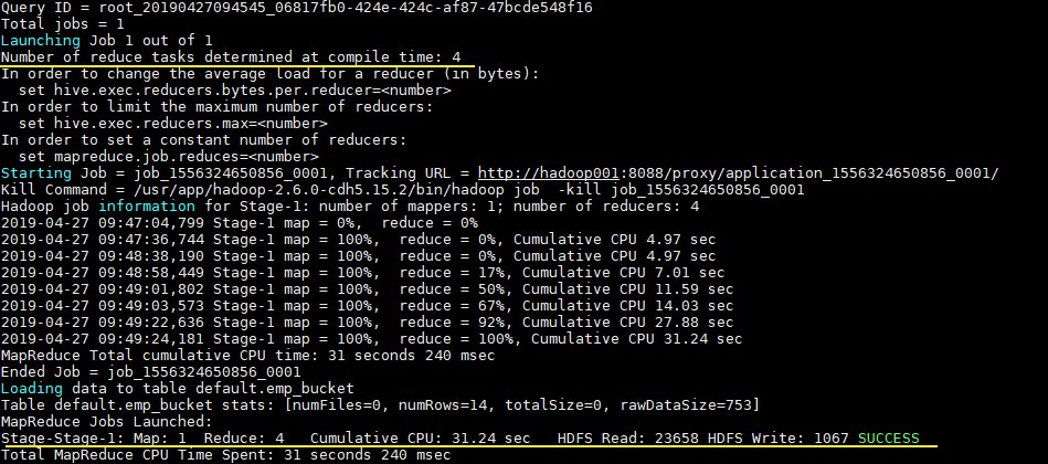INSERT INTO TABLE emp_bucket SELECT * FROM emp; --这里的 emp 表就是一张普通的雇员表可以从执行日志看到 CTAS 触发 MapReduce 操作,且 Reducer 数量和建表时候指定 bucket 数量一致: